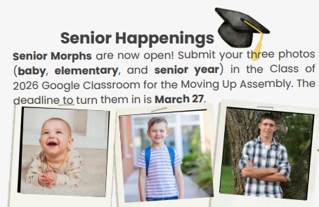 Hello Seniors and Senior Families, Senior Morph pics are due this Friday. It is a non-student day, but it is still the deadline. Please submit them this week, you will be glad you did and so will w...