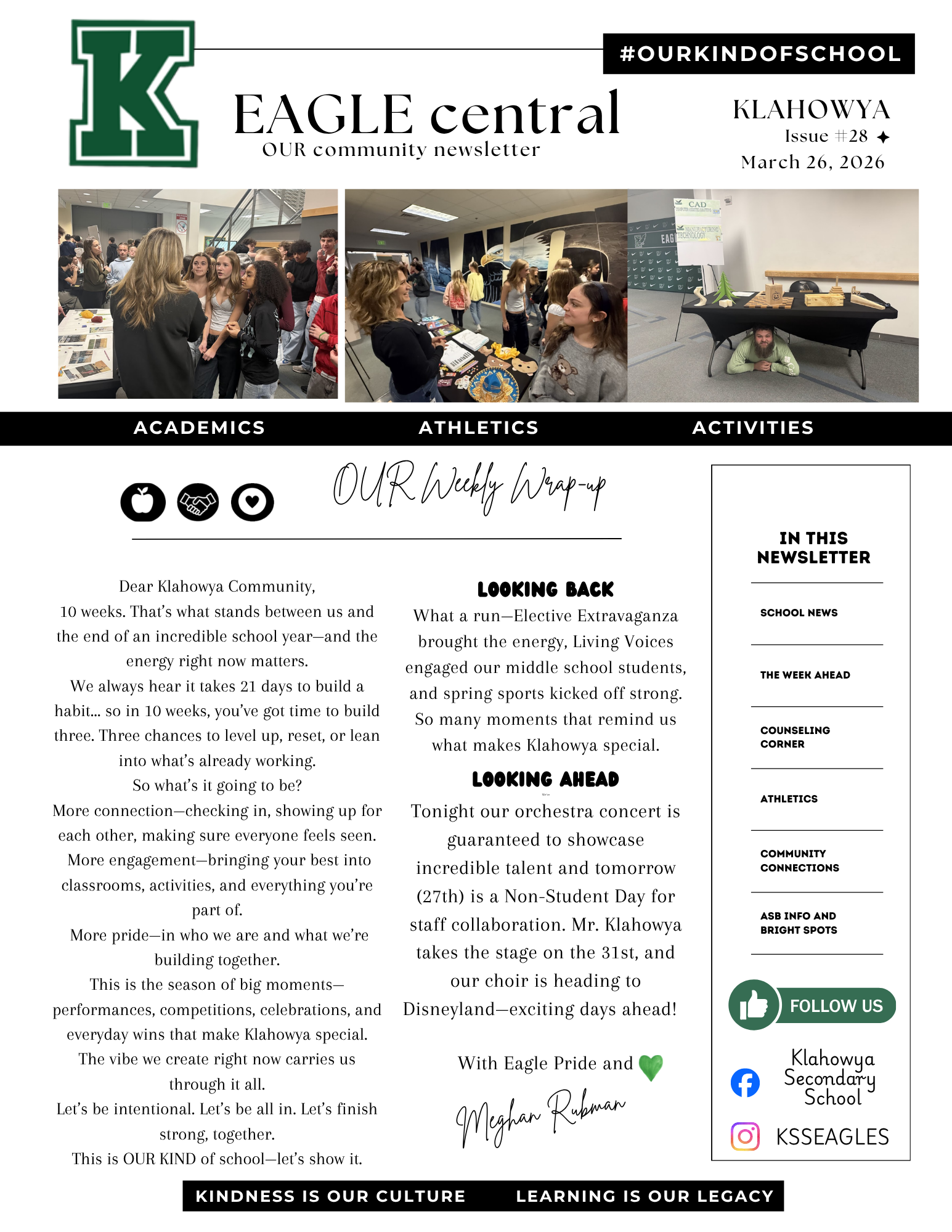 Hello Eagle Community, Here is your weekly newsletter. Please open the attachment to view the links. We had a lot happening this week with the MS Social, Navigating HS and Dual Credit Night, not to...